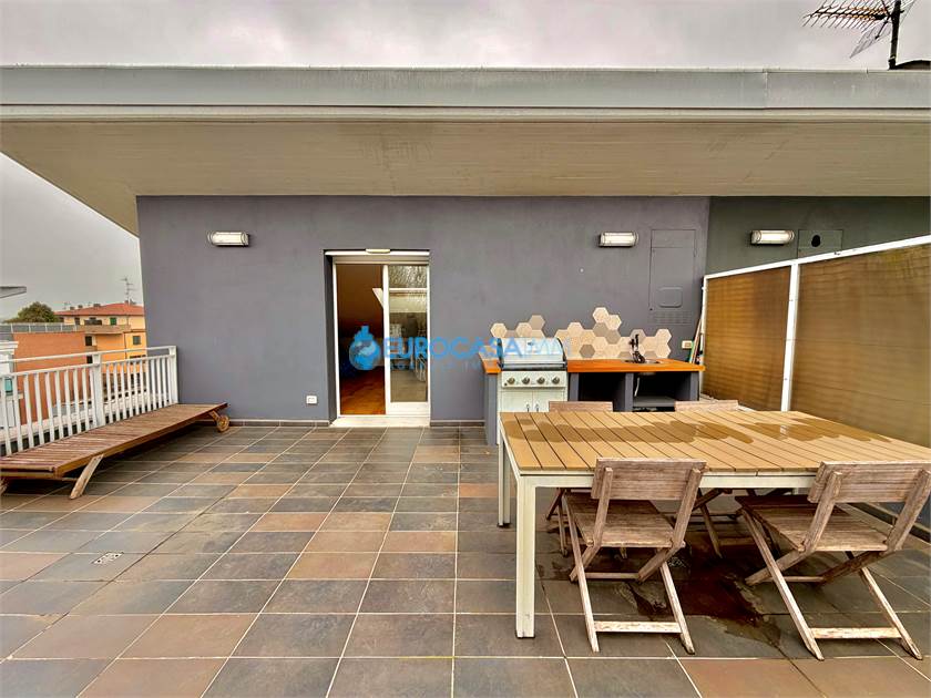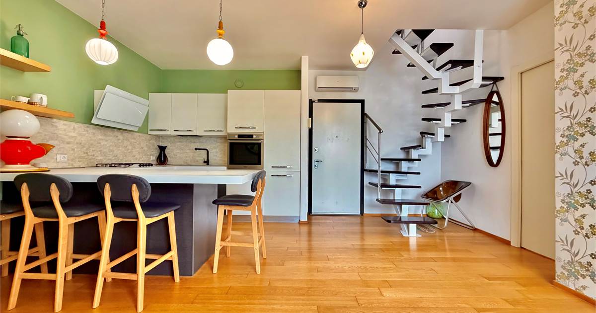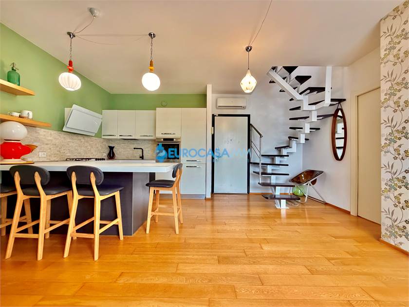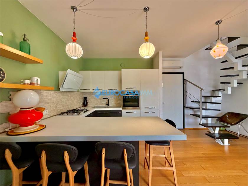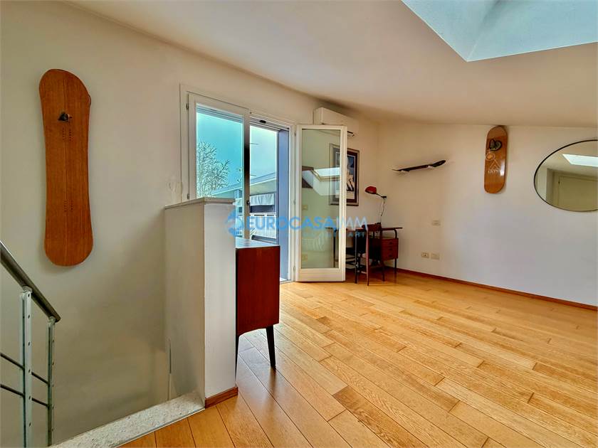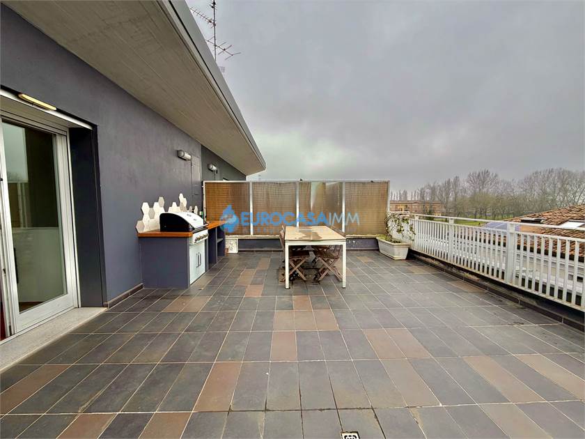 SAN MARINO DI CARPI, ATTICO/DUPLEX. In una zona residenziale tranquilla e ben collegata di Carpi, proponiamo in vendita elegante attico su due livelli situato al secondo ed ultimo piano con ascensore, in Strada Statale Motta. L’abitazione, di circa 110 mq, si distingue per ambienti luminosi, finiture moderne e una piacevole continuità tra spazi interni ed esterni, grazie alla presenza di balcone e ampio terrazzo vivibile. L’ingresso si apre sulla zona giorno, accogliente e ben distribuita, con soggiorno e cucina a vista completamente attrezzata. Da qui si accede al balcone con affaccio sul giardino interno, perfetto come spazio relax quotidiano. Il reparto notte del piano comprende una camera matrimoniale luminosa, una camera tre quarti e un bagno finestrato con doccia, rifinito con materiali contemporanei. Dal soggiorno una scala di design conduce al piano mansardato, uno spazio indipendente e versatile ideale come terza camera, studio o zona privata. Su questo livello troviamo anche un secondo bagno con vasca idromassaggio, pensato per garantire il massimo comfort. La mansarda si affaccia su un ampio terrazzo attrezzato con cucina esterna, perfetto per pranzi e cene all’aperto, momenti conviviali o relax nelle stagioni più calde. Le finiture interne sono curate: parquet nei principali ambienti, bagni in ceramica, infissi in legno bianco con doppio vetro, tapparelle elettriche, porta blindata e addolcitore. L’immobile è dotato di riscaldamento a pavimento e climatizzazione con pompa di calore, per un comfort ottimale tutto l’anno. Completano la proprietà un garage al piano interrato con accesso da cancello elettrico condominiale e parte dell’arredo compreso nel prezzo, tra cui cucina, armadiature e zona attrezzata del terrazzo.